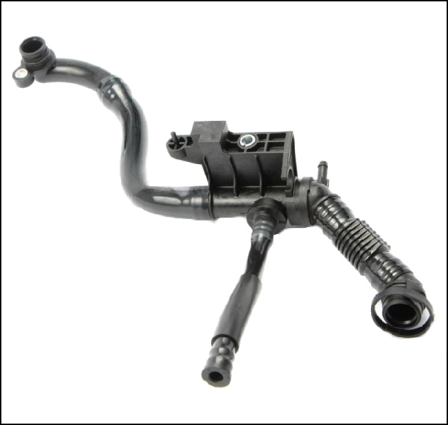 Note: This version of the PCV assembly is for later cars newer than 2010 with 1.4 TSI engine and is secured at the timing chain cover end with a bolt rather than with a plastic clip, as shown in photos